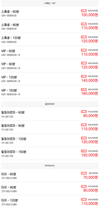 º 다양한 힐링 프로그램: 스웨디시, 아로마, 타이 마사지 등 고객님의 취향과 컨디션에 맞춰 선택할 수 있는 다채로운 마사지 프로그램을 운영하고 있습니다.